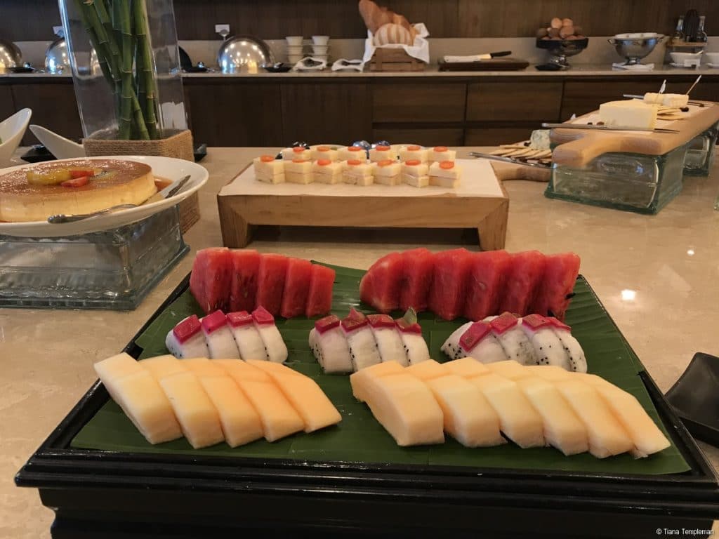 We are tempted to head upstairs to the Summit Rooftop bar on level 20 to enjoy its superb views of Hanoi. However, as we do not want to spontaneously combust due to the day’s unseasonably high temperature, we opt for a few drinks and nibbles in the air-conditioned club lounge. There is a wide range of snacks on offer, including hot nibbles such as spring rolls, sushi, cheese, dips and sandwiches plus delicious cakes. Pacific Club guests have a choice of breakfast in the club lounge or Pacifica.