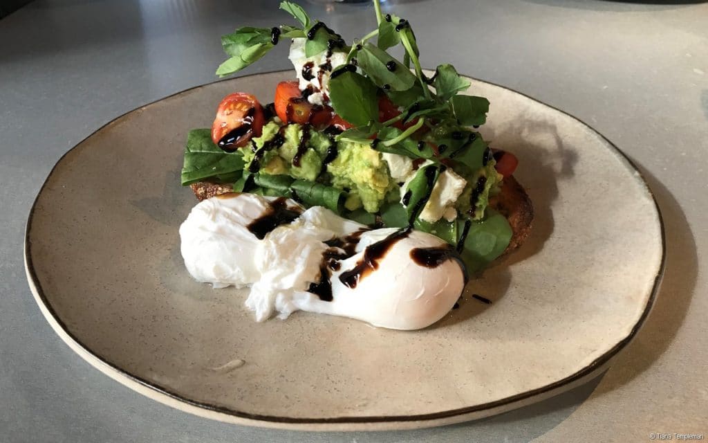 Smashed avo with poached eggs at Tumbling Stone