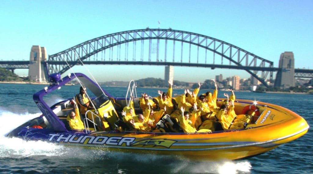 I take one look at the bright yellow jet boat and my body-length spray jacket and can’t help but wonder what I’ve let myself in for, especially when the driver tells us to remove our hats and sunglasses “unless they’re really, really tight” and fasten our seatbelts. Not “low and tight” like they said on the flight here, but “so tight you can’t fit a bit of paper in there.” Plus I’m seated next to the jet boat equivalent of nervous flyers, a couple of teenage girls who are already squealing as we putter out of Circular Quay. Something tells me they haven’t been on a jet boat before.