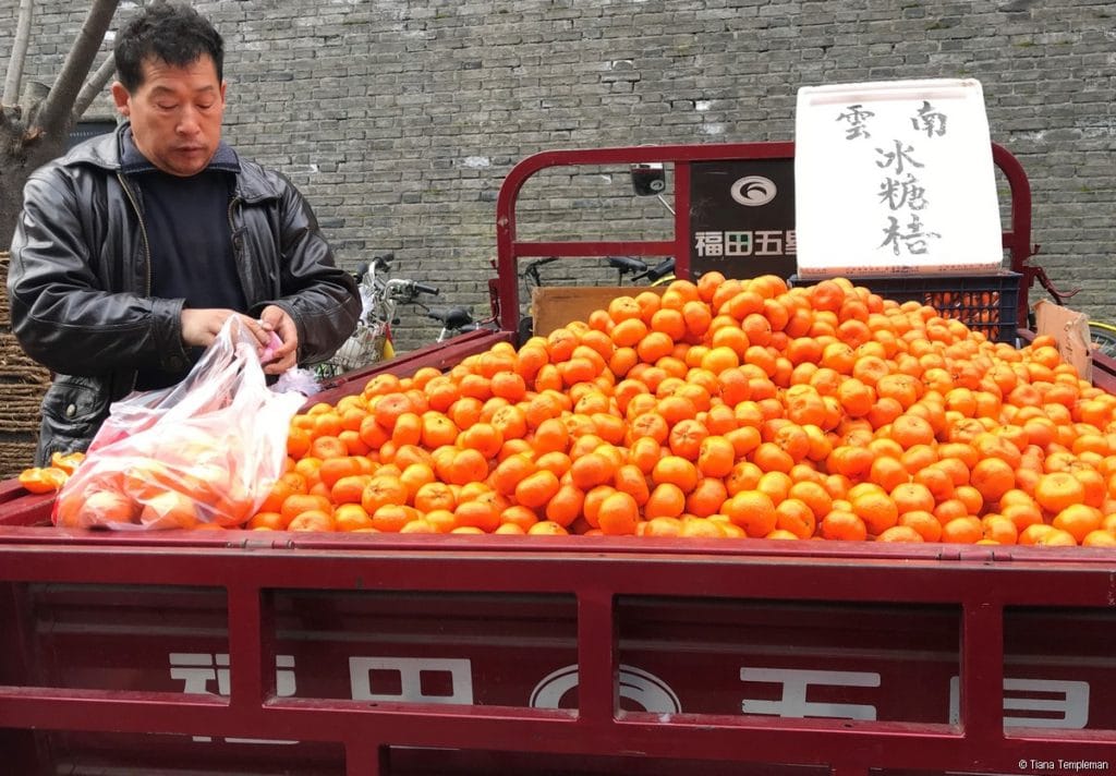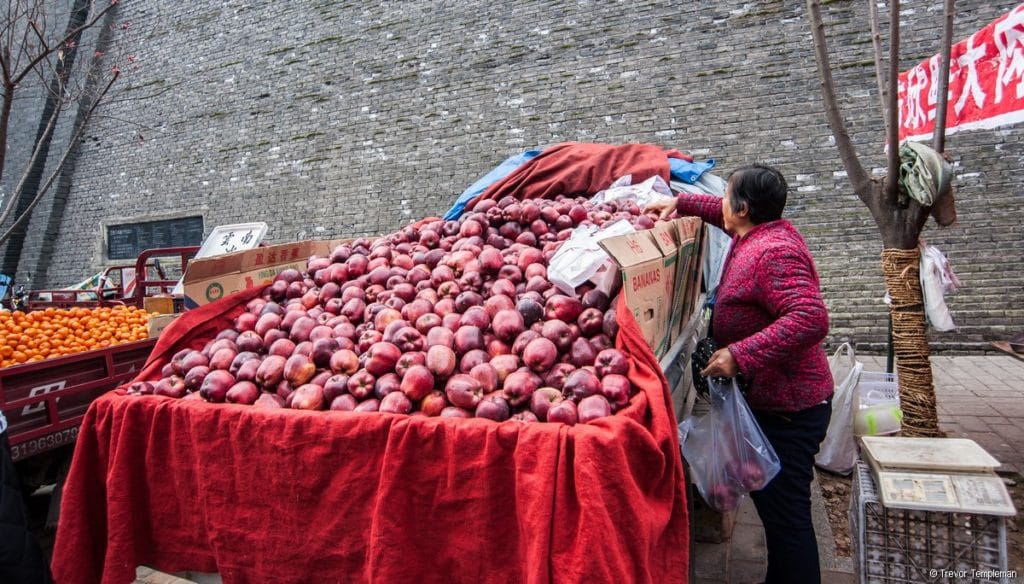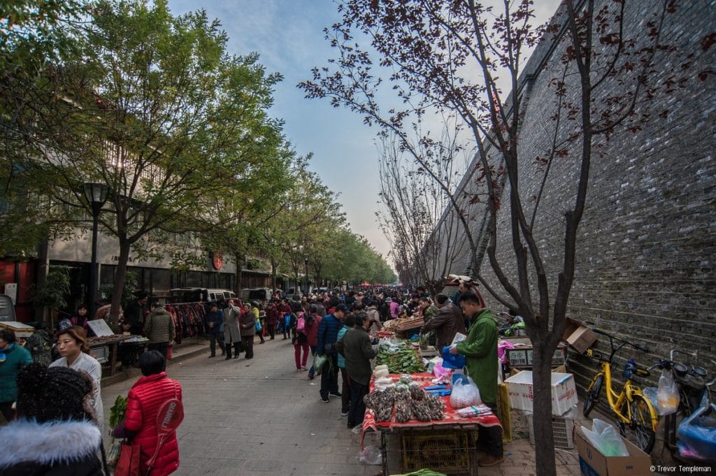 We took a short bus ride to our next destination, Hanguangmen morning market, which was located adjacent to the city’s inner wall. Pomegranate is a local specialty and was in season while we were in Xi’an, with the majority of the fruits grown at Lintong where the terracotta army is located. Not surprisingly, there were many stalls selling this popular fruit as well as plenty of other locally grown fruit and vegetables. Michelle explained that the area around Xi’an has some of the best agricultural land in China and that good local produce is always readily available, although few young people have time to shop at a traditional market like Hanguangmen these days and tend to visit a supermarket instead.