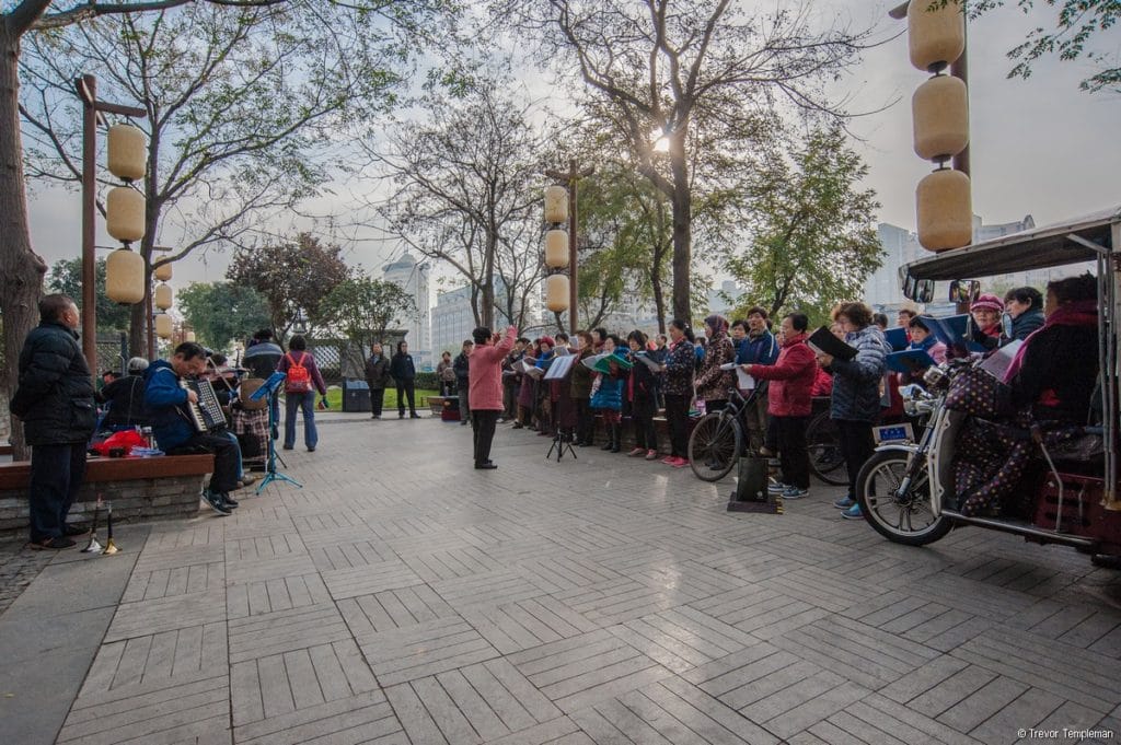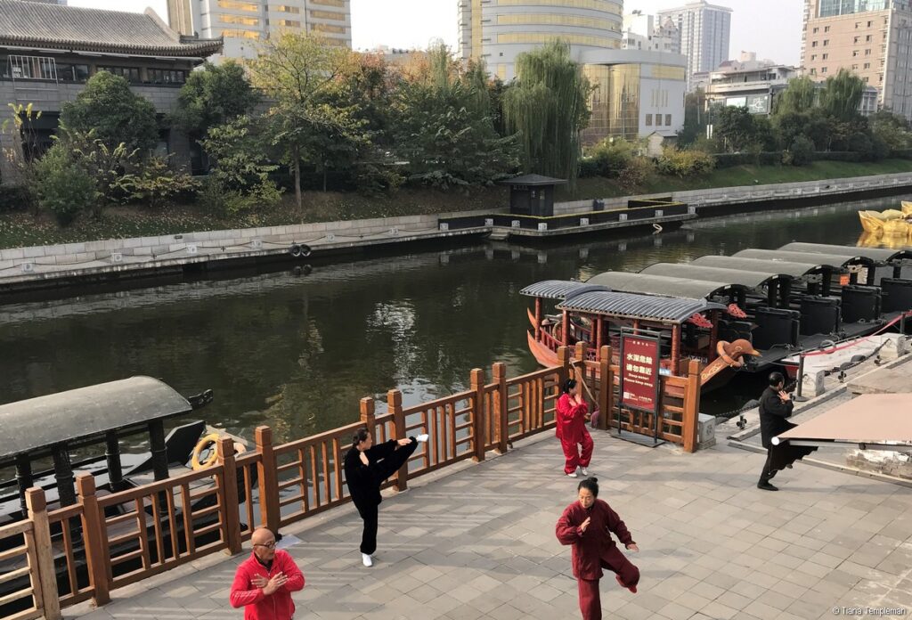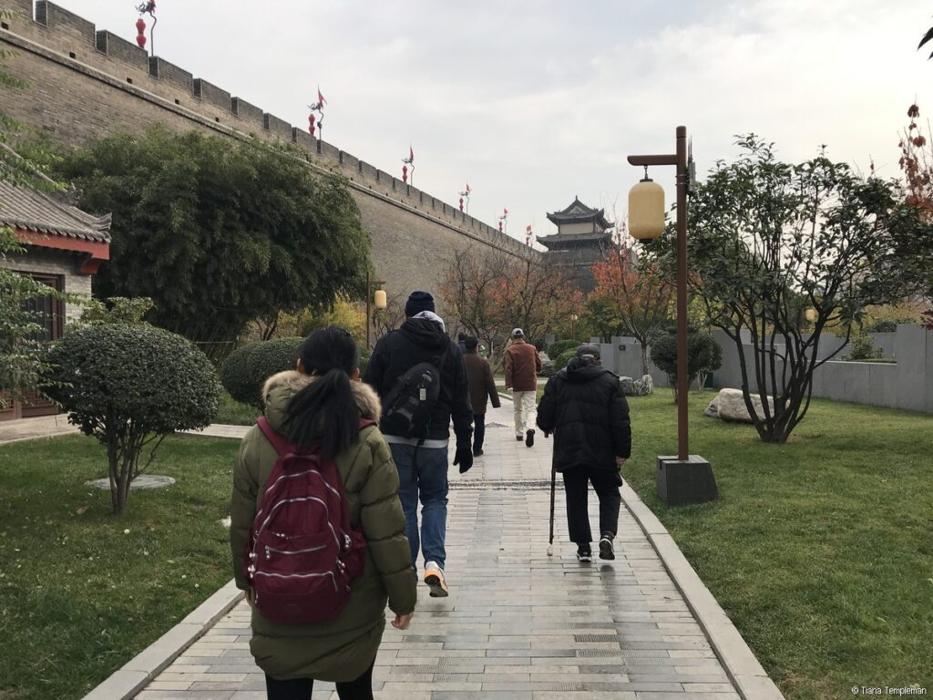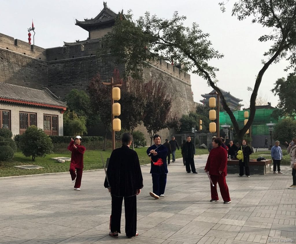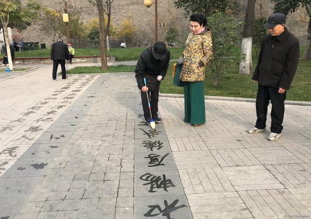We needed a food break by then so it was perfect timing for a stroll to Xi’an City Wall Park where locals were participating in activities including tai chi, fan dancing and Qin opera which is the traditional opera of the Shaanxi Province. We also enjoyed watching some men practicing water calligraphy, writing original poetry on the ground with large brushes dipped in water. Michelle translated some of the poetry for us and it was beautiful.
