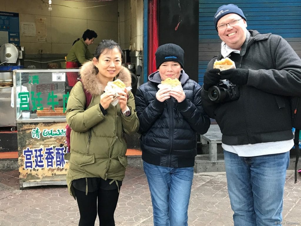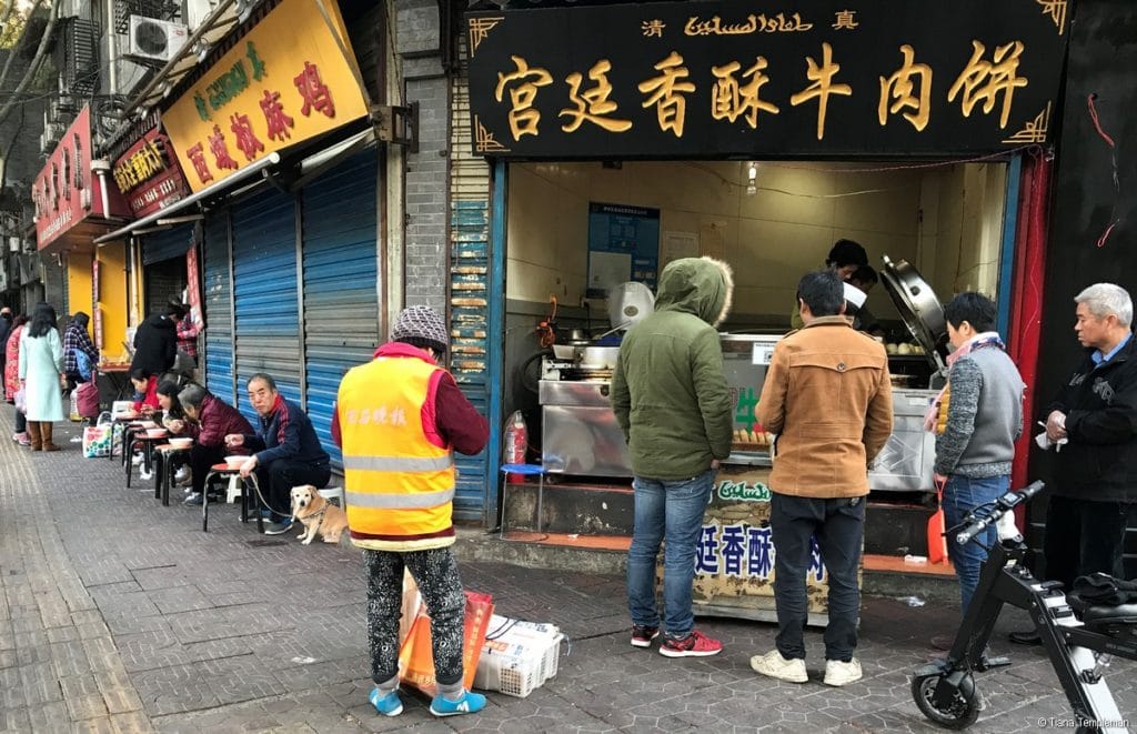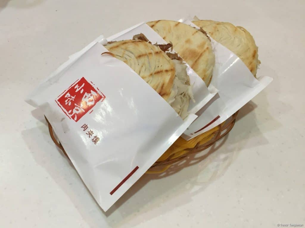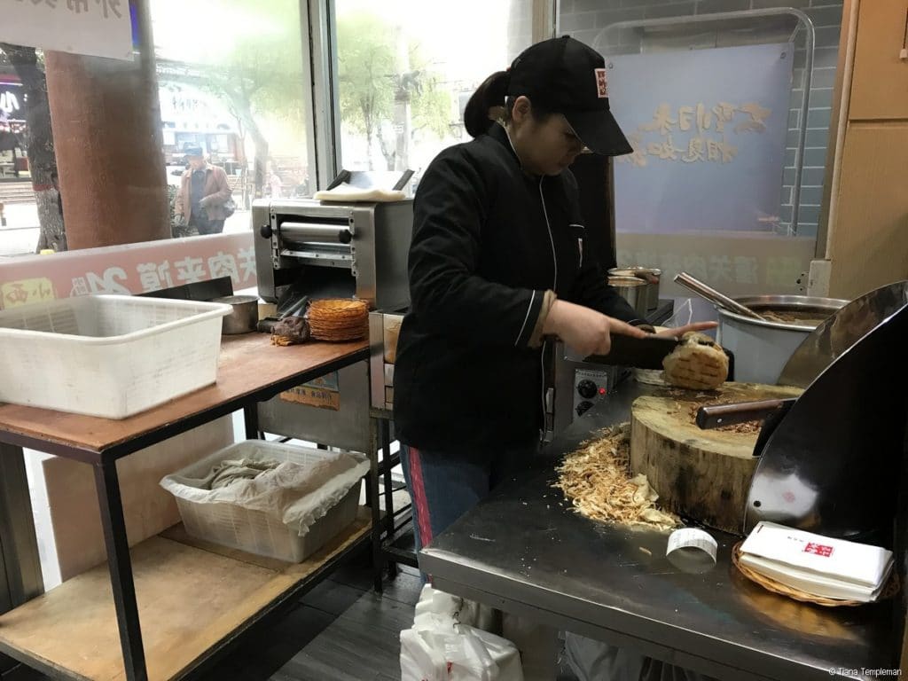 Instead Michelle eased us into the local street food scene with our first dish of the day, a roujiamo (or Xi’an hamburger) which consists of baked leavened bread and shredded meat. These are available from street stalls throughout the city and roujiamo restaurants which resemble a fast food store, like the one Michelle took us to. We are fairly adventurous when it comes to trying different foods, but if you were a bit nervous this first restaurant would certainly put your mind at ease about signing up for a food tour. Our roujiamos had plenty of finger licking goodness and were not that spicy. However, they were very, very tasty with juicy meat and bread that was flaky and soft yet crispy on the outside.